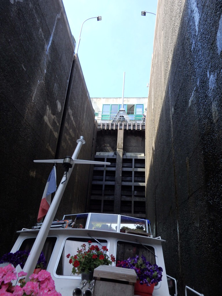 Share a lock with us! This is a deep one for a canal, and quite narrow. The big one on the Rhone, which all of you who have read Just Passing Through will know well, is much bigger. This is approx 15 metres in depth, whilst La Bollene was twice this deep.
