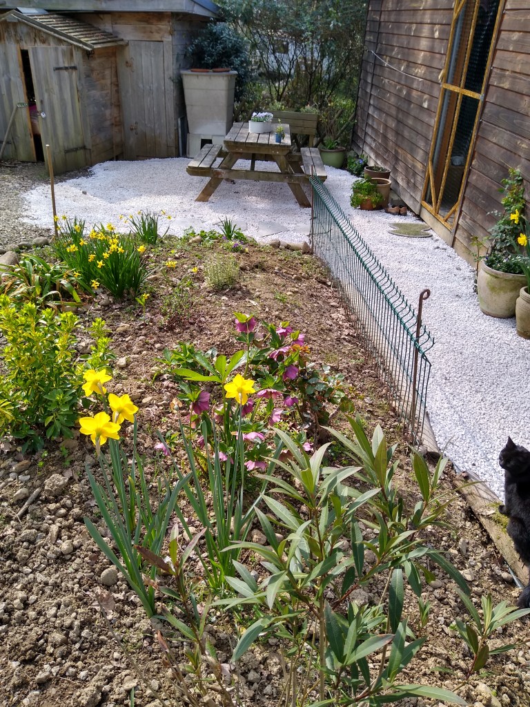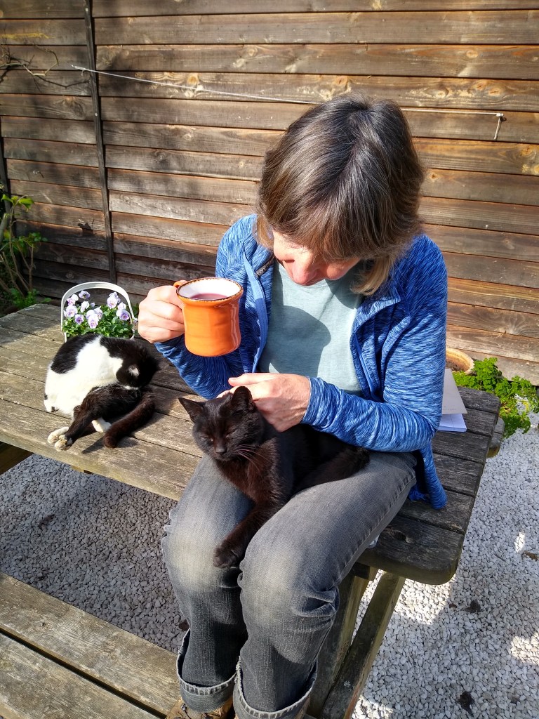 The weather has been good so we have enjoyed a number of lunches sitting outside on our bench. Food has to be guarded zealously from the cats but we have a system now. We feed them first round the corner, and then have at least five minutes of relaxed eating before it becomes a battle for who gets what. Spot is adept at pretending to leave and then coming in for a stealth attack in a bid to grab a lump of cheese from the plate or stick her head in a mug of tea, but after she’s been physically thrown off the table a few times, she gets very annoyed and goes off in a huff. Blackie, who for months has kept her distance, has suddenly decided that we are ok after all and now creeps onto my lap for a cuddle at every opportunity.
