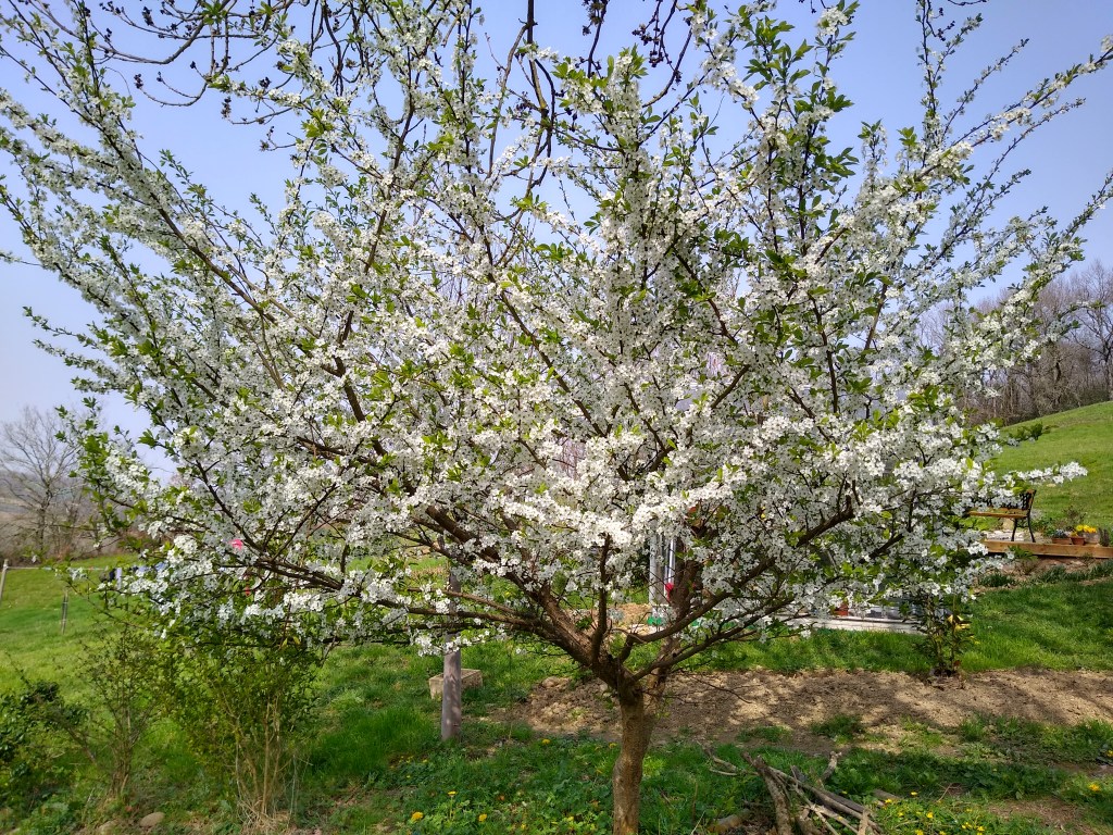If all that is pretty bleak, then nature is doing her best to keep our spirits up. The daffodils I planted last autumn are putting on a lovely show, a small cherry tree behind the cabin that looked half-dead when we arrived is now full of blossom.