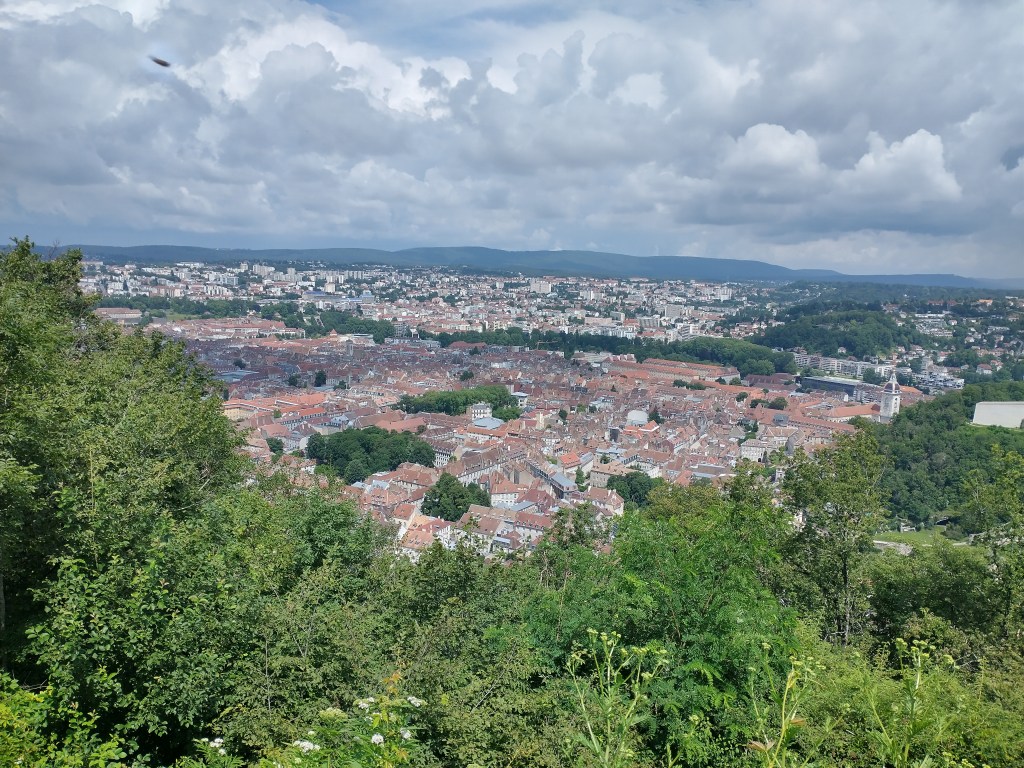 We visited Besançon around ten years ago on one of our tours in our beloved old Hymer motorhome. It’s not a place you forget. The old town is contained within a loop of the River Doubs, as you can see from the photo below, and towering above it in the following shots are the forbidding, impregnable walls of the Citadel.