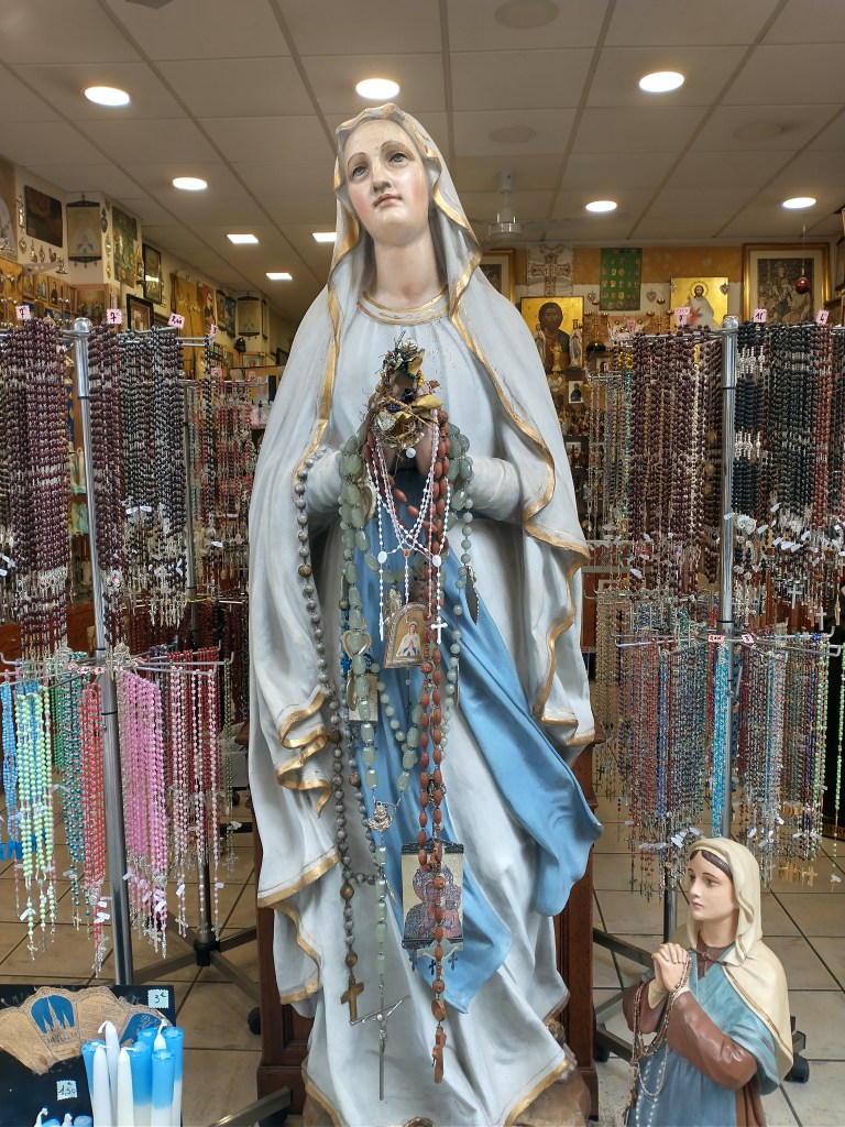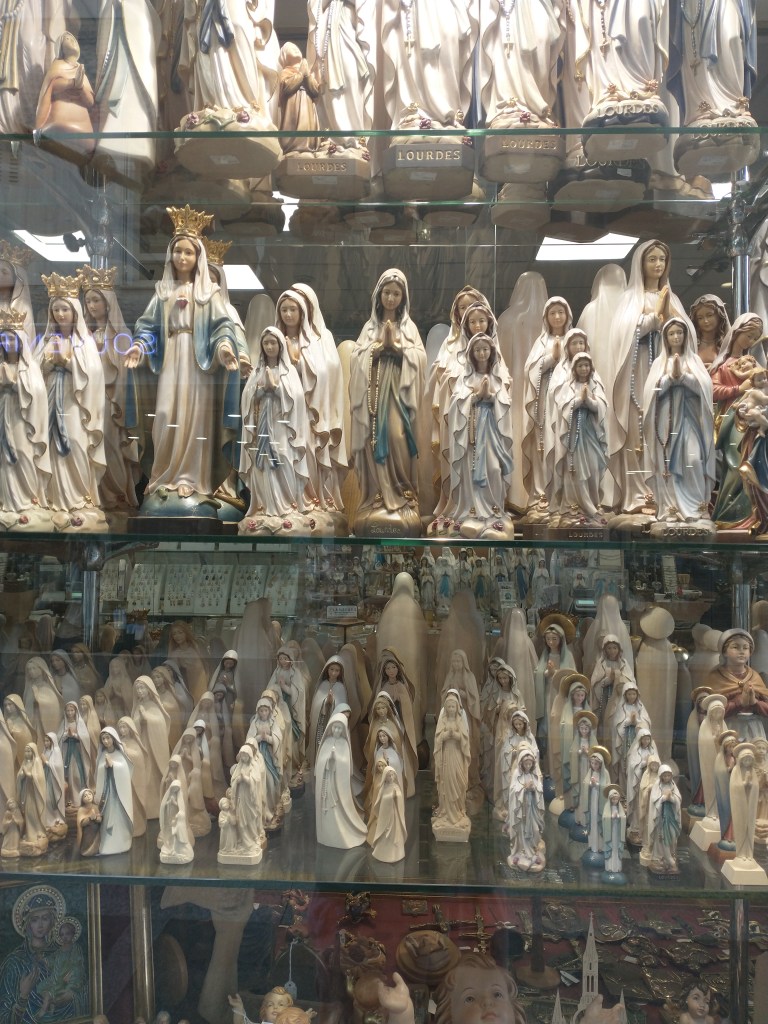 Lourdes is a strange place. It brought to mind childhood memories of a fading seaside town back in the UK, but instead of shops selling candy floss or sticks of rock, and arcades of jangling slot machines that were always so irresistible to me and my brother as small children, the shops in Lourdes were dedicated to separating the pilgrims from their money with a simply astonishing selection of religious memorabilia.