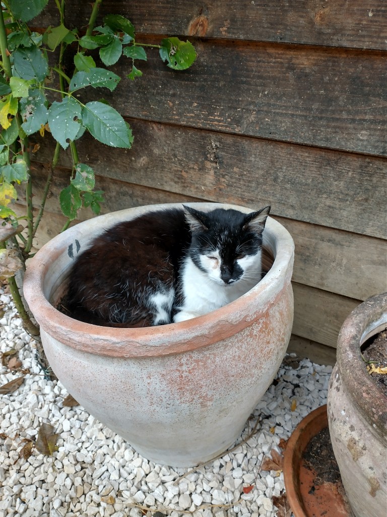 I’ll leave you with a picture of a contented cat. I emptied out my summer pots of their dead plants before I left and Spot has found one of them makes an excellent bed.