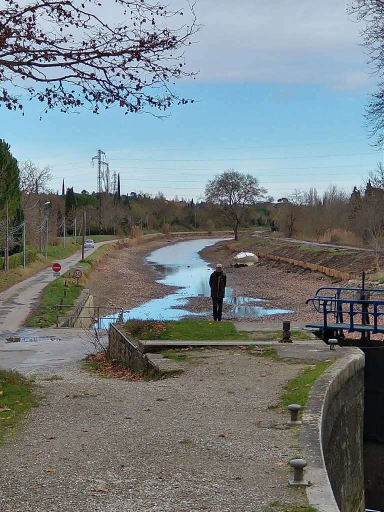 The canal is looking very different this time round as it has been emptied for maintenance work. The staircase of locks that opens into the lagoon was a mass of concrete, no more than a puddle of shallow water with leaves scattered over the surface.
