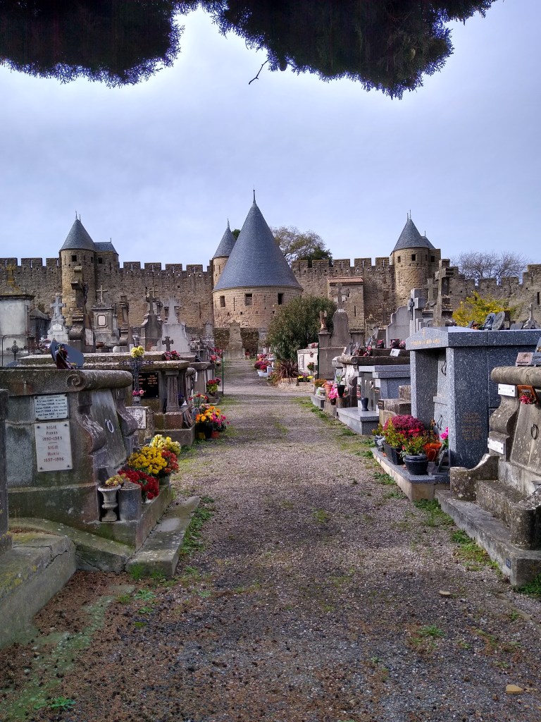 Help came from an unexpected quarter. There is a large, very old graveyard opposite the entrance to the citadel.  I wouldn’t expect a graveyard to be a cheery sort of place, but this one was full of colour. The gravestones and mausoleums were bedecked with chrysanthemums and cyclamens from ‘Tousaints’ in November, a time when the French remember their loved ones and place flowers on their graves. The wind and rain  of the last few weeks meant the blooms were pretty much on their last legs but even so I found that the colours lifted my mood.