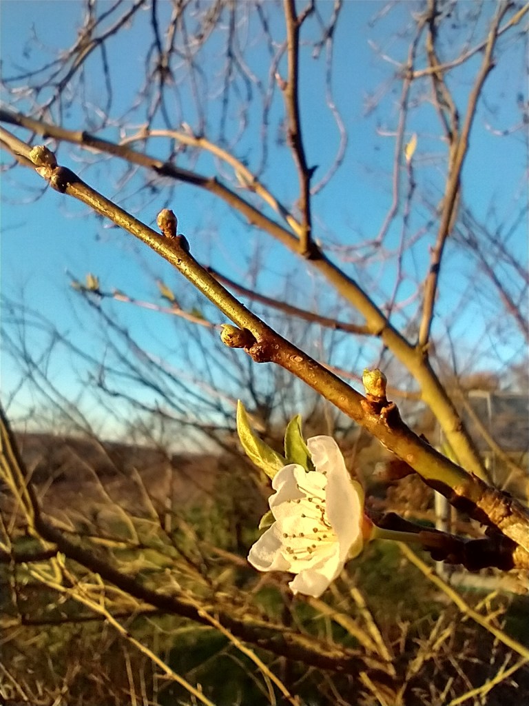 I walk past the spot where we buried Maddie last May, give her an imaginary stroke on her soft ears and say hi, on past the place where we park the van at the far end of the field, making a mental note for the tenth time that the wisteria needs cutting back, and then continue my way along the track to the pond, which is frozen over and strangled by weed yet again. This gentle ramble re-connects me to our home and is a mixture of the familiar and the new, for there is always something else to look at. This time round I can see the bulbs that we planted last autumn poking through the damp soil, and one brave and foolish daffodil is almost on the point of flowering, despite the frosty mornings. The lenten rose is in bloom, hiding its face under the vines, the lilac is in bud and our plum tree has, wondrously, got one fragile blossom reaching skyward on the sunny side of the tree.