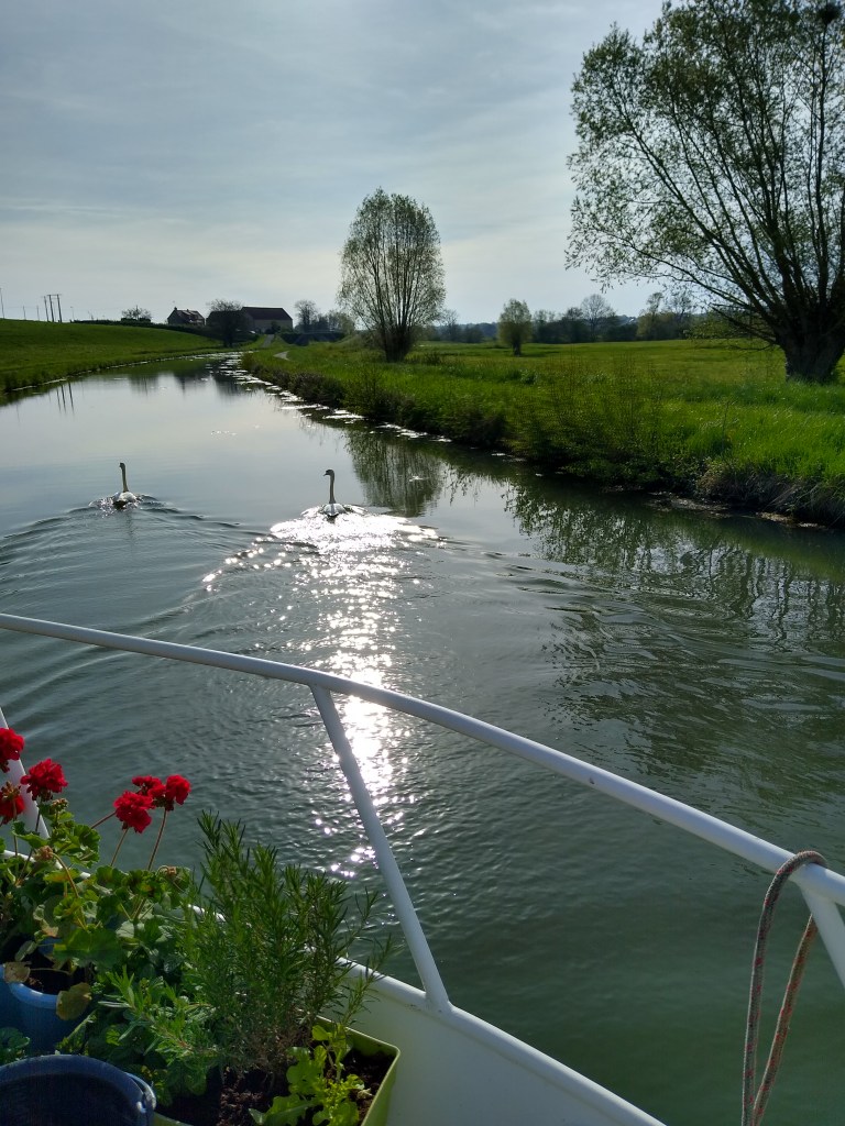 The weather makes all the difference whilst cruising. April is a difficult month to predict but we’ve been lucky this week, with temperatures around 19- 20 degrees, and blue skies. The shorts came out, as did the white legs, and we revelled in the joy of spending the whole day outside. Our evenings were spent on peaceful bankside moorings, often by ourselves, having our dinner outside on top deck and amusing ourselves with Rummikubs and Bananagram as the temperature dropped, forcing us back inside. We fell asleep each night to the sound of silence. If there is paradise on earth, then this is our Eden.
