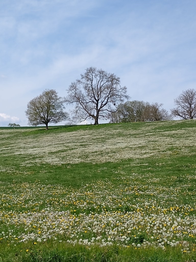 The canal banks and surrounding fields were sprinkled with cowslips, bluebells and buttercups, and a host of other wild flowers that I don’t know the names of. Each year I look them up, whether I am on the canals or back at Le Shack, and each year I forget them. The lush pastures that are a feature of this rural waterway rolled themselves out like a carpet up a slight incline to a ridge that follows the canal, looking strangely as if they had been dusted with icing sugar, an effect caused by a profusion of dandelion seed heads, softly white against that vivid green that we only get in spring.