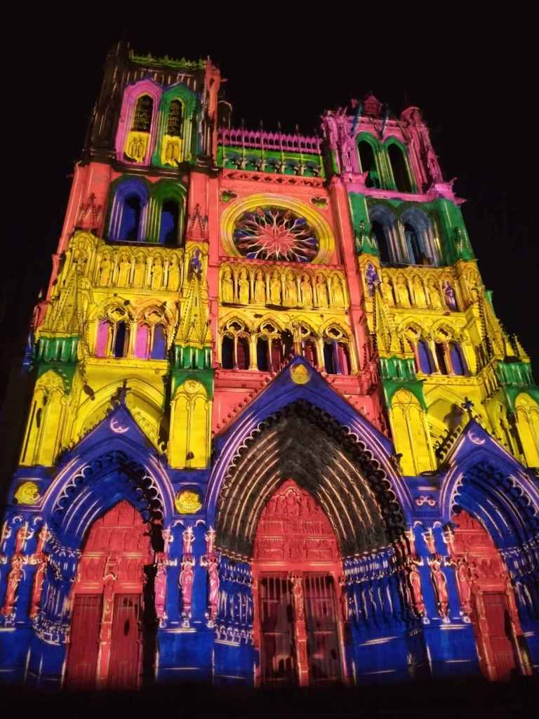 After several nights in quiet, rural moorings we arrived in Amiens. Like most cities and large towns in France, Amiens hosts a ‘son et lumière‘ on summer evenings from late June/early July through to September. For those of you who might not be aware of the concept, it is a sound and light show projected onto an iconic building, usually the church or cathedral. The show lasts for about forty minutes, and is completely free. We’ve attended many of these events over the years and found that standards vary from place to place, and even from year to year, but we always try and see at least one each summer.