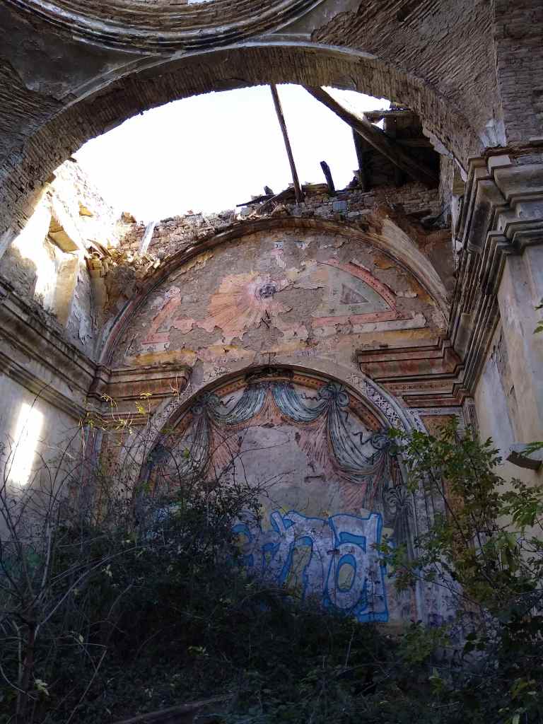 We made our way past buildings with no roofs and gaping windows. Peering into small terraced cottages, where families would have shared their own Christmas meal years ago, we saw piles of stone and roof timbers sticking up at odd angles, abandoned where they fell. Spindly saplings had self-set in this barren ground and were growing up and out through the holes in the roofs whilst the brambles smothered everything as they always do. The church would once have been the heart of the village but was now a sad place, graffiti scrawled over its crumbling walls, most of the roof gone, and the painted ceiling above the alter fading with each passing year.