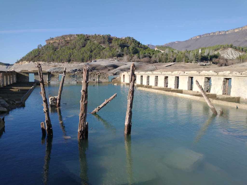 Looking down to the flooded valley floor we could make out the remnants of the thermal baths, part of the lower village of Tiermas, and with ten or fifteen people floating in the warm, health-giving waters. The baths traditionally disappear as the water levels rise over the winter but with so little rain this year, the water levels were very low, yet another sign of changing weather patterns.