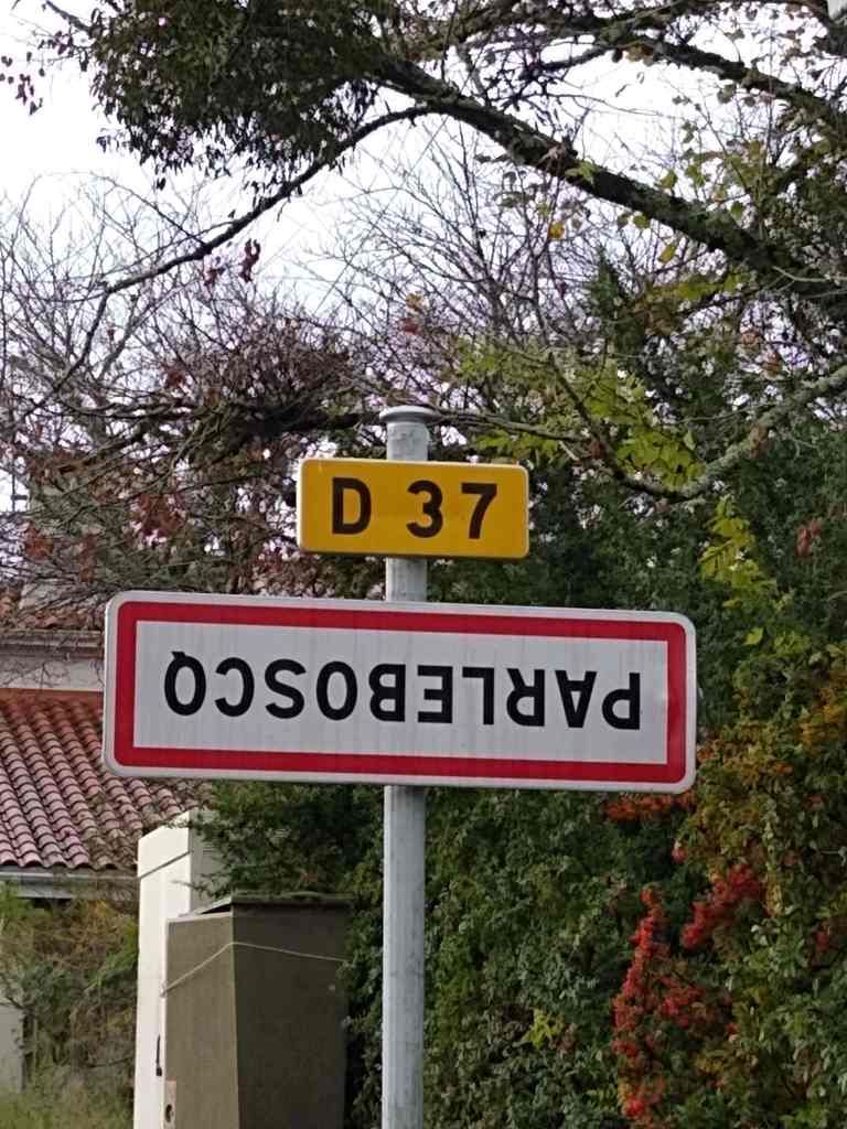 This is part of a protest movement by young farmers in France, rebelling against a whole raft of EU regulations that they feel are unacceptable and unfair. The signs, denoting a village or a town, have been targeted country-wide, perhaps as many as 40,000 in total. The farmers claim that it is a high-profile and humorous way of raising awareness about the problems they face without causing ordinary people any inconvenience.