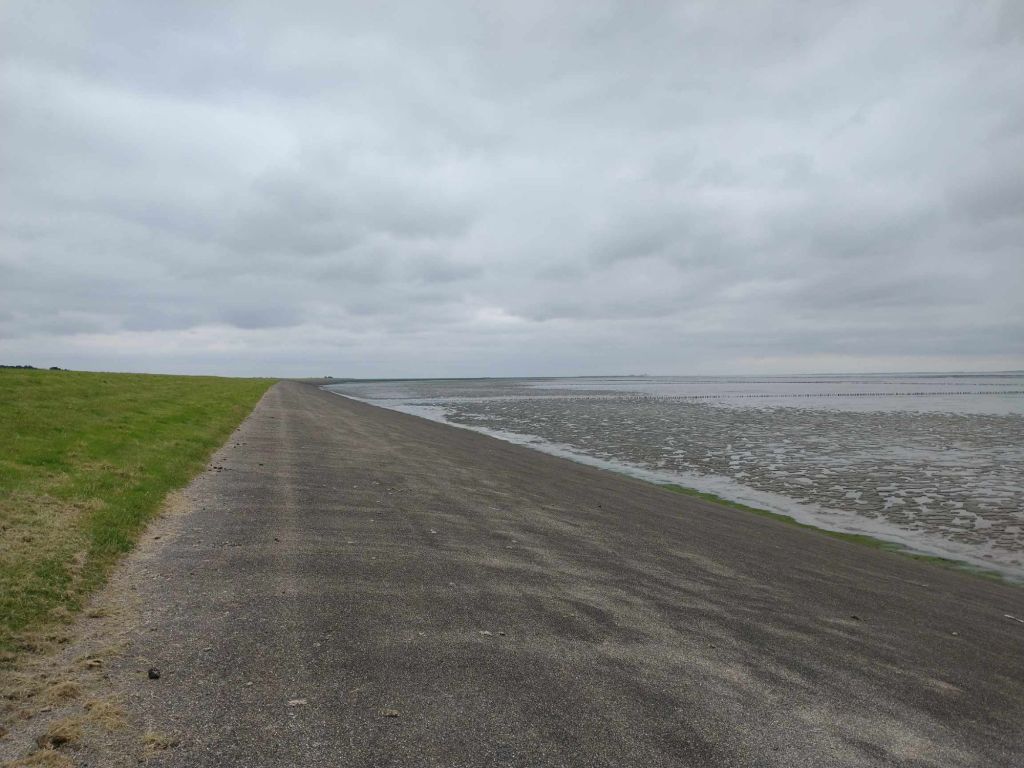 Whilst some parts of the coast in the Netherlands are made up of beautiful sandy beaches this section is mud flats. The high tide comes right up to the dyke which is made up of tarmac on the coast side and grass on the land side.