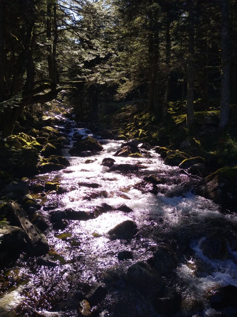 The dense canopy created a landscape of shadows: branches stretched tapering fingers across the trail, their mottled outlines weaving a tapestry beneath our feet, and a stream raced with single-minded intent over rocks, other-worldly, etched in black and silver.